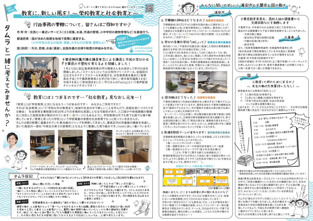 年4回発行される「うらやす議会だより」の企画・編集を行っています。市民の皆様に議会の活動をより分かりやすくお伝えできるよう、紙面の構成や内容を検討しています。